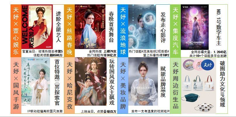 元圆科技“带着”天妤进行了一系列创意性内容的输出:除短视频内容创作外,天妤与壹心娱乐签约、与电影《流浪地球2》 梦幻联动、开年之初首登陕西卫视2023丝路春晚、与明星艺人哈妮克孜联动、与新华网等官方媒体进行合作。从流量积累走向商业化落地,凭借强劲的实力,天妤成为品牌跨圈层传播的新宠。天妤不断打破大众对于虚拟偶像商业价值开发的固有认知。不到一年的时间,其商业合作已扩展至影视、游戏、美妆、汽车、传媒等多个领域。元圆科技将天妤IP与文旅场景、消费场景、城市场景相融合,打造数字化泛娱乐新玩法,建立起极具创意的虚拟内容营销生态体系。