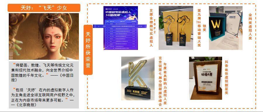 随着虚拟偶像在广告、直播领域的应用,国内互联网巨头都开始将虚拟偶像作为营销的手段,众多游戏公司、技术公司和社交娱乐公司纷纷入局,推出各式虚拟偶像。定位“虚拟人”的科技文娱公司元圆科技推出了首个文化出海的国风虚拟数字人“天妤”。将壁画、飞天等传统文化元素和现代技术融合,独特的国风人物设定,精美的人物形象使“天妤”一出道便广受好评。目前,天妤全网粉丝超550w,视频播放量超4亿,抖音点赞量近3000w,相关话题播放量破9亿。