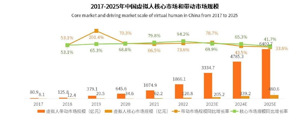 iiMedia Research(艾媒咨询)数据显示,2022年中国虚拟人核心市场规模为120.8亿元,预计2025年将达到480.6亿元;2022年虚拟人带动周边市场规模为1866.1亿元,预计2025年为6402.7亿元。艾媒咨询分析师认为,虚拟人在内容和周边产品产出方面有着较强的可塑性,能根据时代潮流发展不断开发新的爆点,行业增长的延续性较强,未来一段时间内都将保持稳定增长态势。